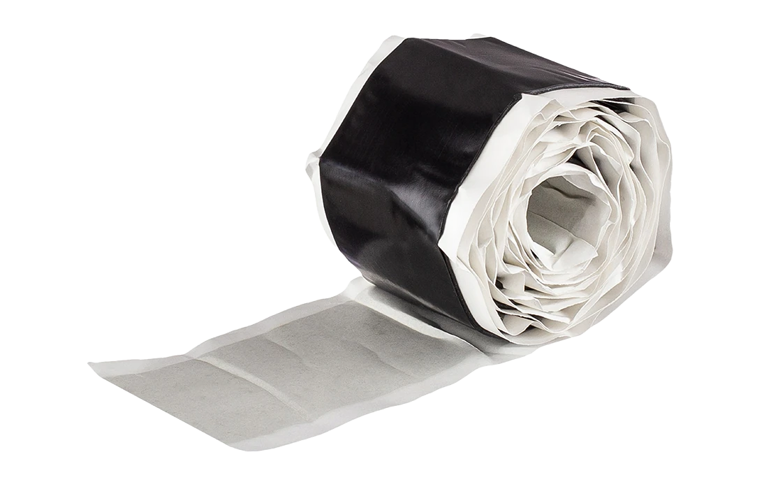 Лента герметизирующая на полиэтиленовой основе с клеевым слоем постоянной липкости, черного цвета, дублирована одним слоем силикононизированной бумаги.